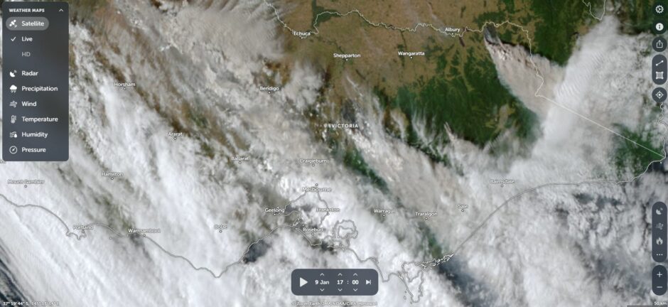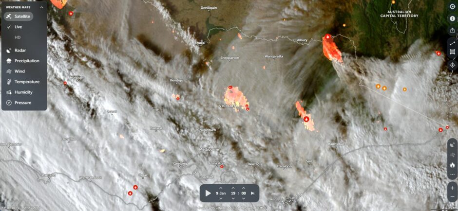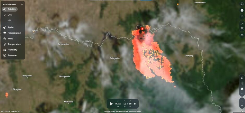 NASA Zoom Earth on January 9 with the Walwa fire and the Longwood fire clearly visible. Another major fire is located south of the Walwa fire burning within rugged country of the Great Dividing Range.