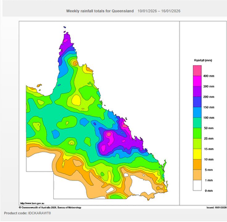 Weekly rainfall for Queensland ending Friday 16 January 2026. The rainfall impact from Tropical Cyclone Koji is clearly seen around Mackay.