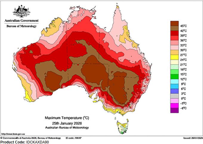 The Mallee and Wimmera regions and northeast regions (Low lying areas) experienced maximum temperatures topping 42C for the day.