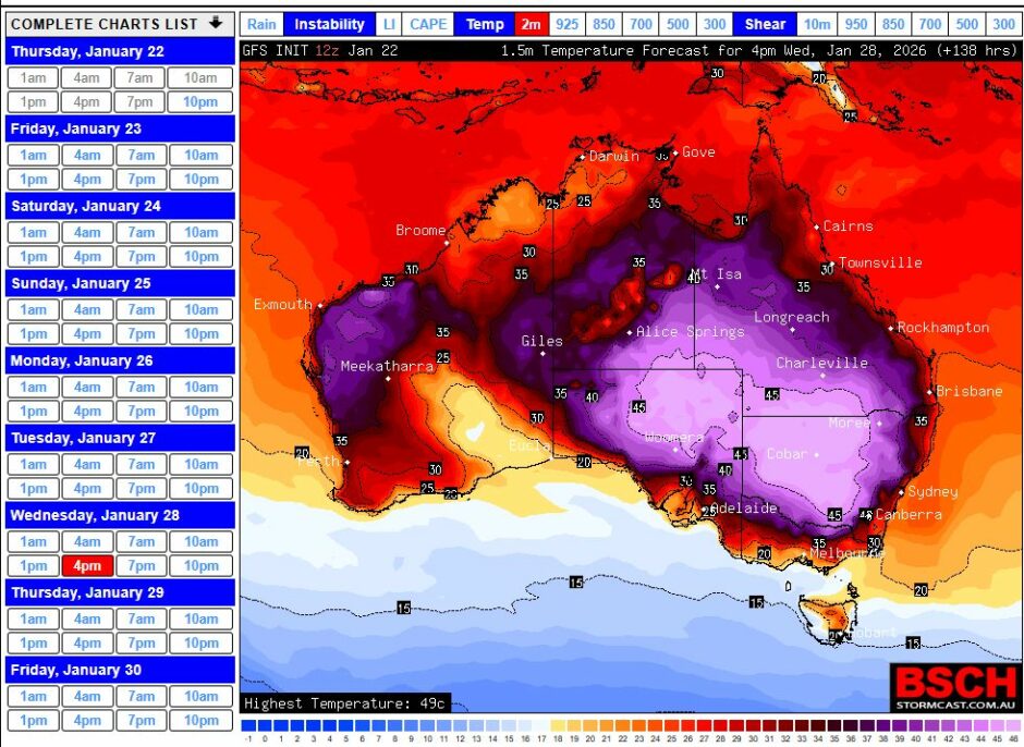 The heatwave that is anticipated is expected to cross through South Australia during Saturday arriving across the inland southern Australia by Sunday. What is most interesting about this event is that the heat appears to stagnate for at least 4 to 6 days across the same region before starting to break apart by Thursday 29 January 2026.