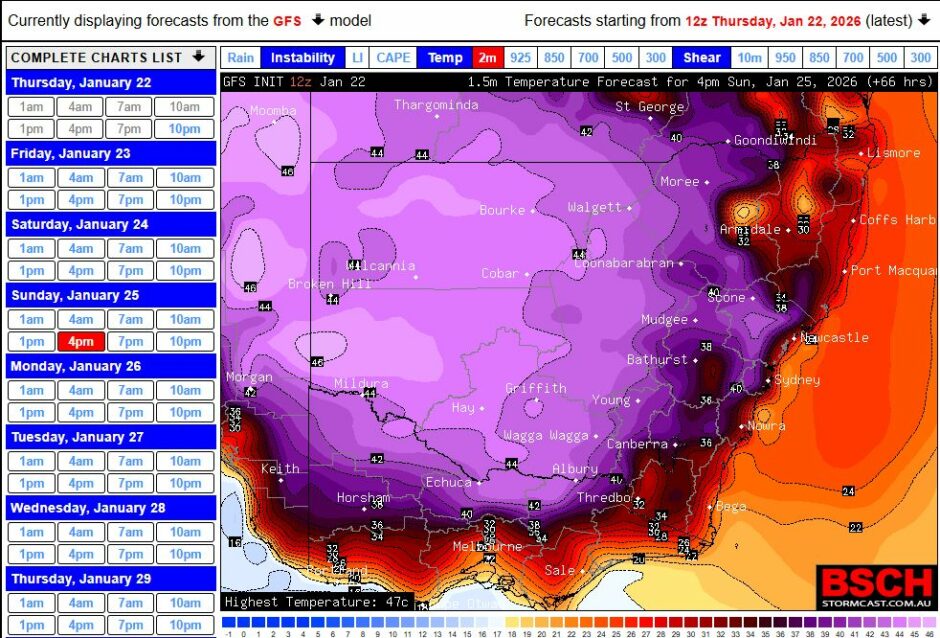 What is most unusual about this event is that forecasts of 44C to 46C and even 47C is being made for towns such as Bourke, Condobolin, Griffith, Mildura, Tibooburra. These are extreme maximum temperatures usually confined to inland desert regions. Instead, it is suggested that such conditions will encroach into areas that rarely if ever see such conditions for January or anytime during a typical summer.