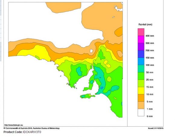 The weather system moved across much of New South Wales and Victoria but the dramatic events that occurred in portions of South Australia did not occur. Reasonable rainfall totals were observed across the highlands of North East Victoria and southern New South Wales but significant downpours did not occur. For the week ending 1/10/16, the whole of North East Victoria and Southern New South Wales had received between 50 mm and 100 mm of rain but this was spread across 7 days. This was enough to cause renewed rises in local rivers and streams and minor flood warnings exists for the Kiewa River.