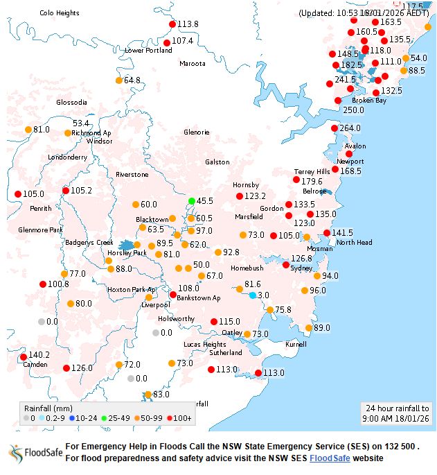 Late Saturday and overnight into Sunday morning, heavy rainfall impacted the Central Coast and most of Sydney where some rainfall totals exceeded 250 mm. The heaviest totals are: