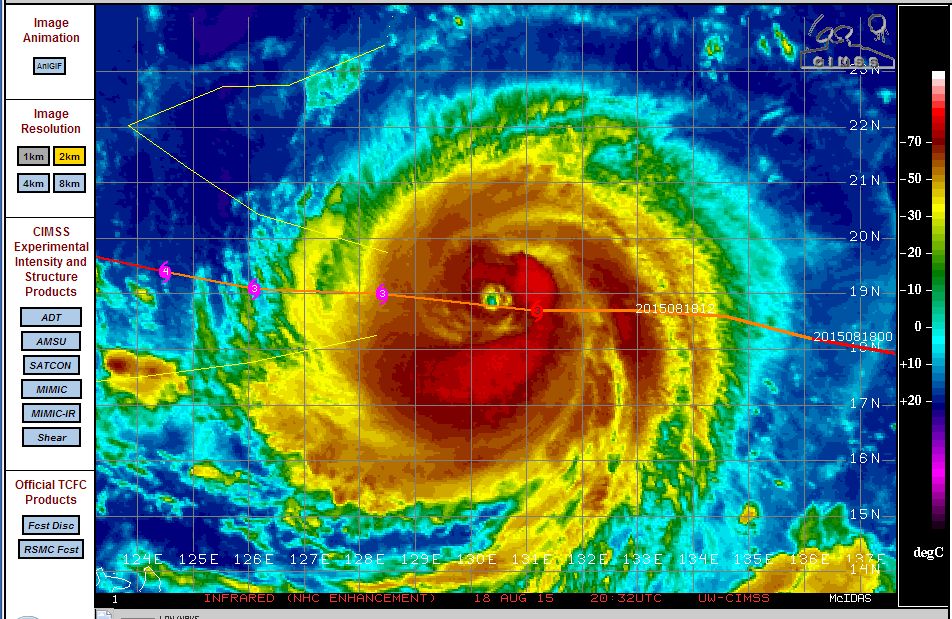 The CIMSS model attached (Acquired 19 August 2015) is showing the storm approaching the northern Luzon Island of the Philippines. However, if the storm curves north westwards or north north west as suggested, then the storm would give the east side of Taiwan a glancing blow. The model is suggesting the whole of Taiwan under threat of this storm especially within 48 hours.