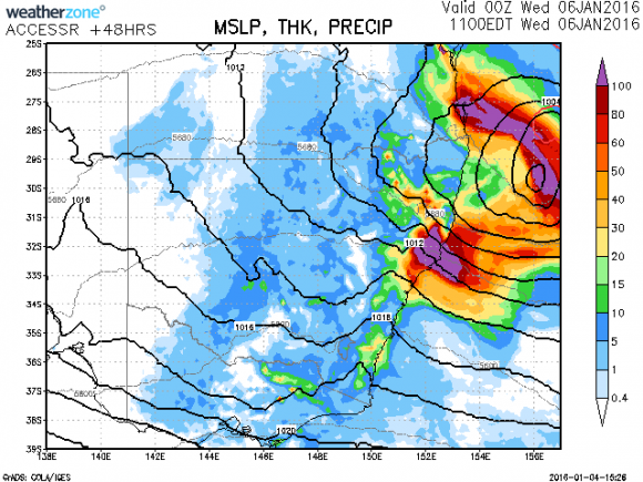 If this prediction comes through, then this is going to provide some very heavy rainfall for the region near Taree in excess of 100mm. Some heavy rain has already occurred along the coastal region south of Sydney and also parts of the coastal region north of Sydney in the past 24 to 36 hours.