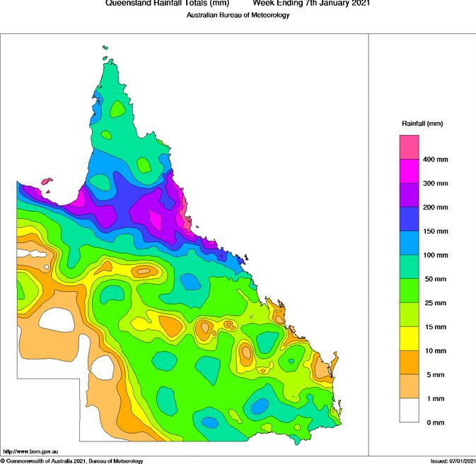 As shown in the plot below taken from the Bureau of Meteorology “Water and the Land”, the heaviest rainfall totals for Queensland for the week ending the 7/1/2021 is shown to be across northern Queensland and the general path of this storm / rain depression across the southern part of Cape York Peninsula can easily be depicted.