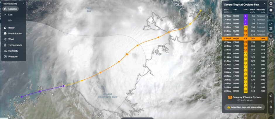 After passing to the north of Darwin between the Northern Territory land area and the Tiwi Islands, the storm is now moving further out to sea but closer to the Kimberley region of Western Australia where it is set to intensify further to a Category 2 system under the Saffir Simpson Scale (Category 3 system under the Australian Tropical Cyclone Intensity Scale 1989) before weakening as it makes its final landfall. The storm is expected to end its lifecycle as it makes its final landfall in coming days.