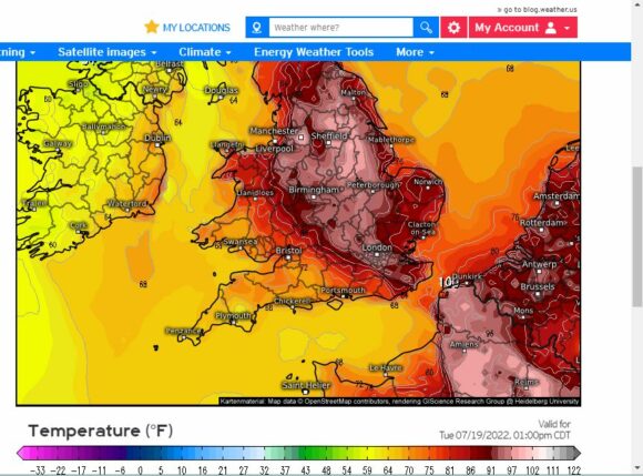 The heat is being dragged northwards across Europe by a strong high pressure cell with the winds emanating from Northern Africa. Weather models do show more intense heat further south across France and Spain but what makes this event unusual is that it has reached Southern England in areas that usually does not experience such high temperatures.