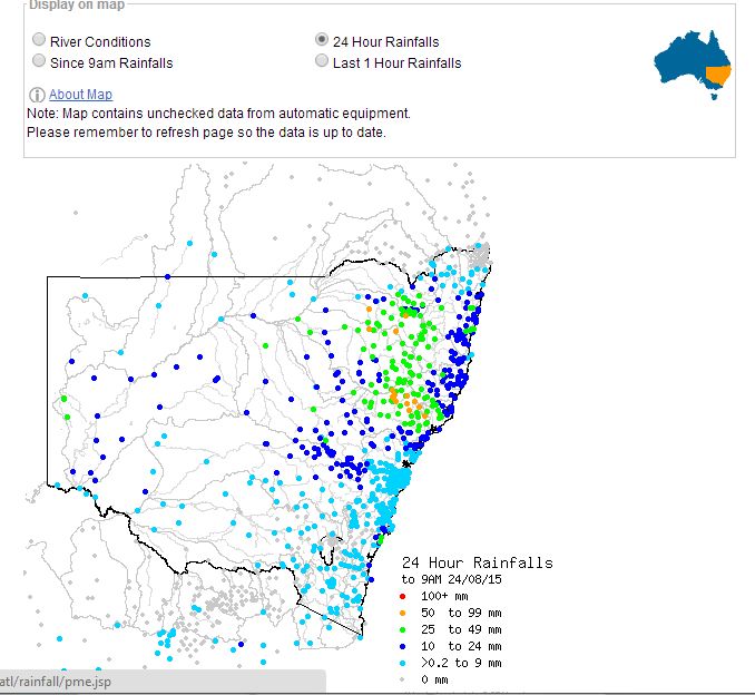 The cloud mass situated over New South Wales has produced some substantial rainfall across parts of the state. For the 24 hours to 9 am 24 August, the best falls occurred at the following centres:-