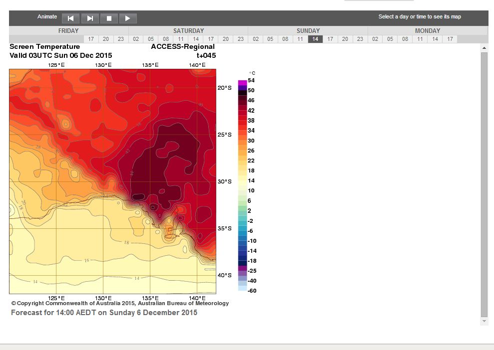 3 - Australia showing the heat across South Australia for 2 pm Sunday afternoon which is clearly evident when compared to the rest of Australia. It is suggested that parts of South Australia will be the hottest locations found anywhere in the country at this time.